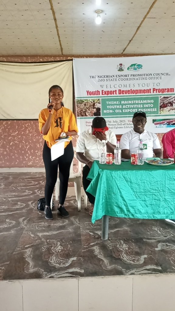 The woman Leader of National Congress of Ohaji Youth, Ms. Amadi Sussan Chinwendu, has called on women and female youths to embrace available opportunities for self development by coming out en- mass in other to be taking part in such things which will be beneficial to them. Ms. Amadi Susan disclosed this during an interactive program between officials of the Nigeria Export Promotion Council (NEPC) and the leaderhip and members of the National Congress of Ohaji Youth (NACOY).